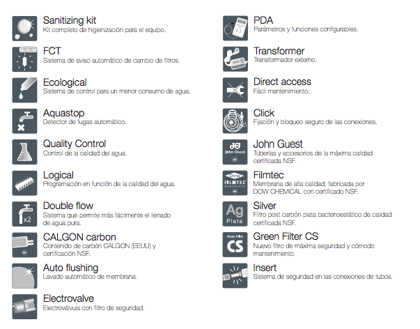 Equipo compacto y reducido. Sistema de osmosis de última generación. Equipado con sistema de limpieza de membrana. Aquastop. Aviso de cambio de filtros.